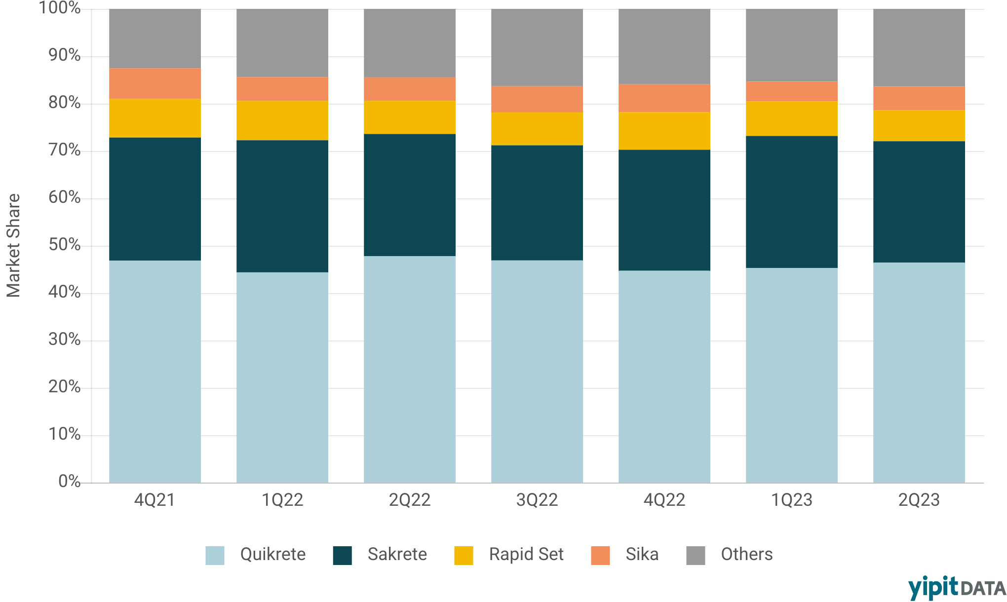 At Home Depot, Quikrete experienced a year-over-year decrease in its market share in 2Q23 (-1.4pp to 46.4%), whereas Sakrete’s market share remained stable year-over-year at 25.6% in 2Q23. Rapid Set, the third-largest brand at Home Depot, observed year-over-year market share declines for the third straight quarter, while Sika remained relatively stable year-over-year in market share, and smaller brands in the space saw a collective 1.9pp increase in year-over-year share. Have these trends been consistent across different retailers?