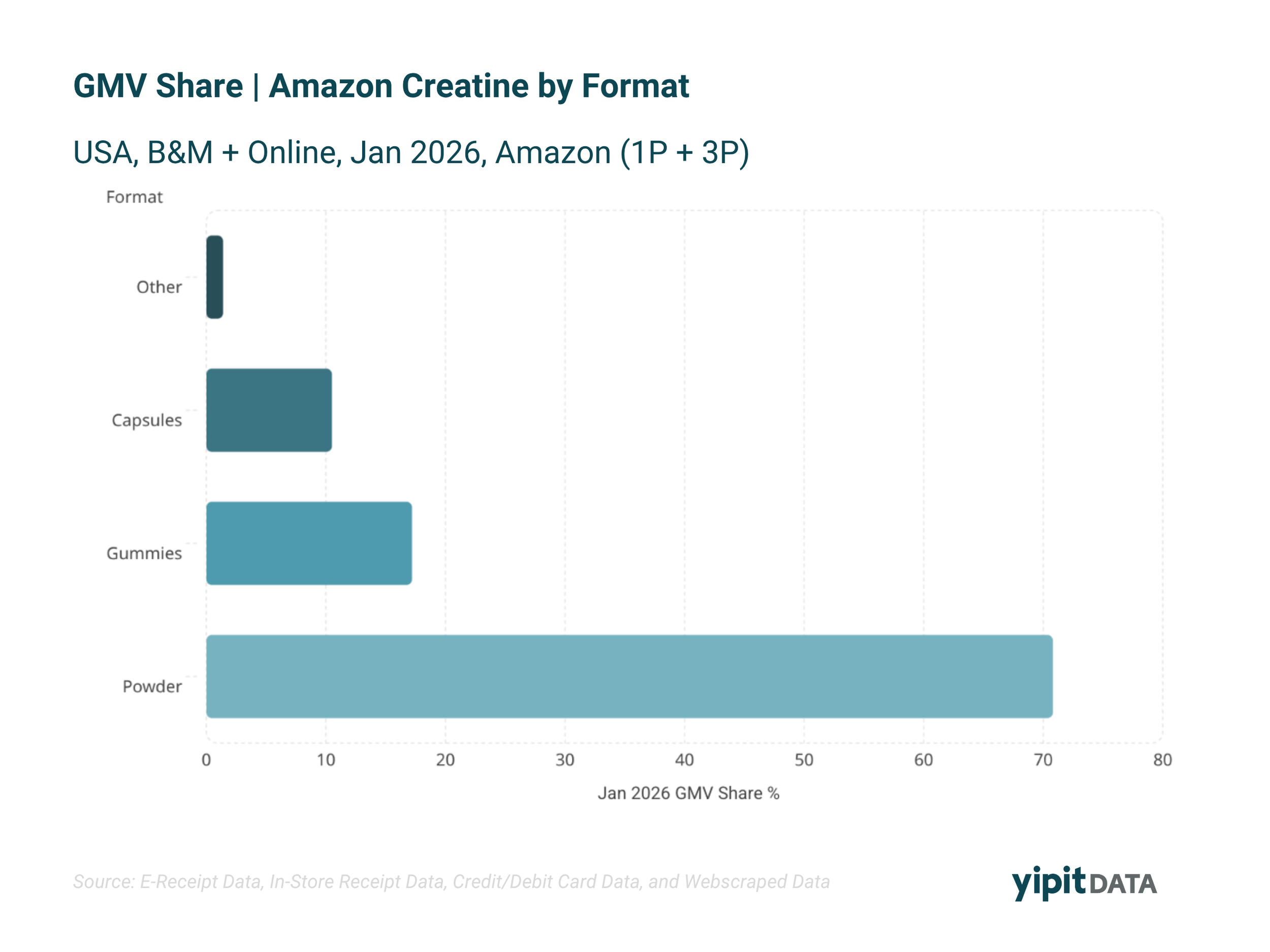 Creatine sales remain heavily concentrated in powder formats, particularly on Amazon, where powder accounts for the majority of category GMV.