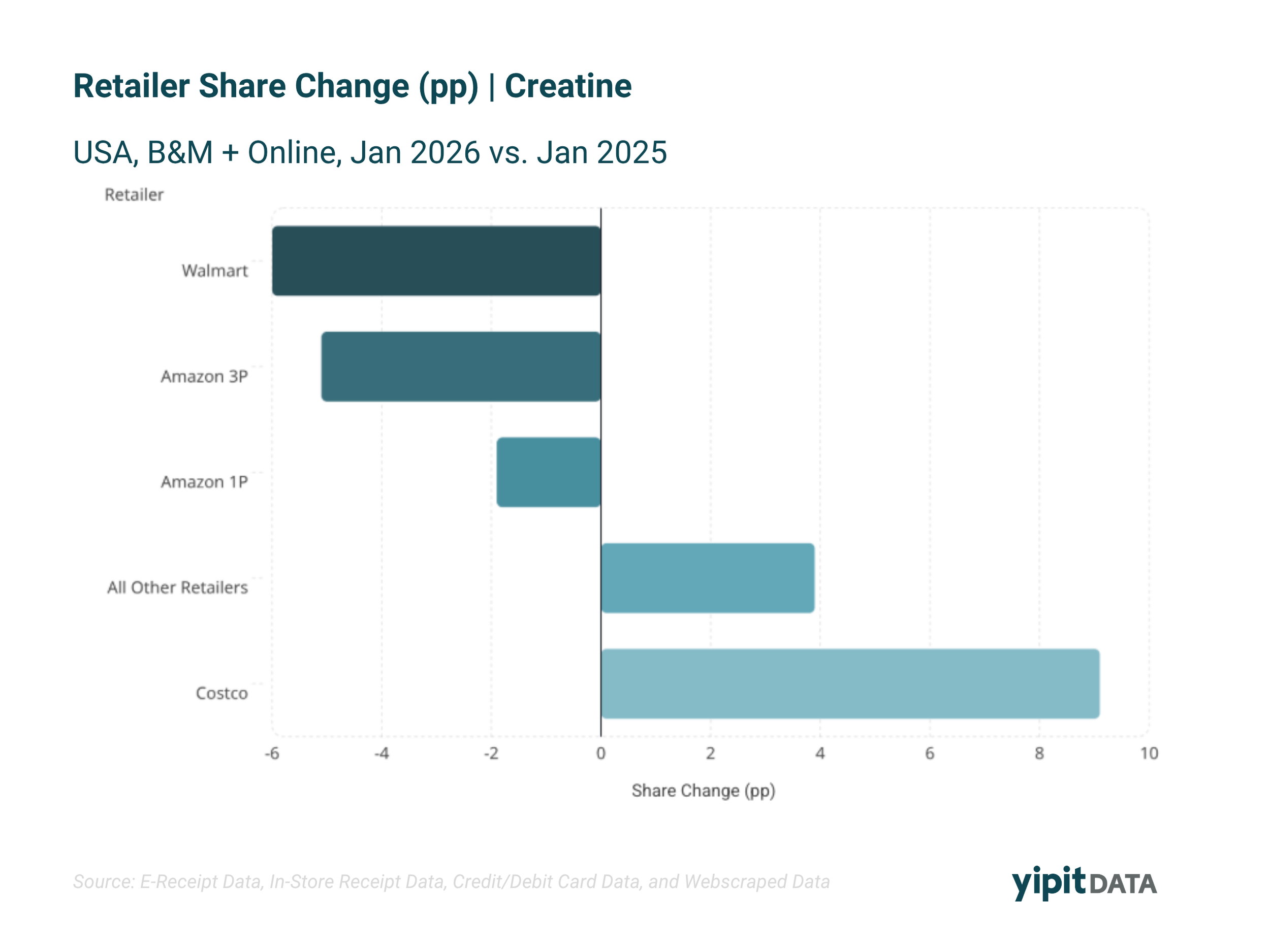 In creatine, Costco recorded the largest share gains, while Amazon and Walmart saw declines.