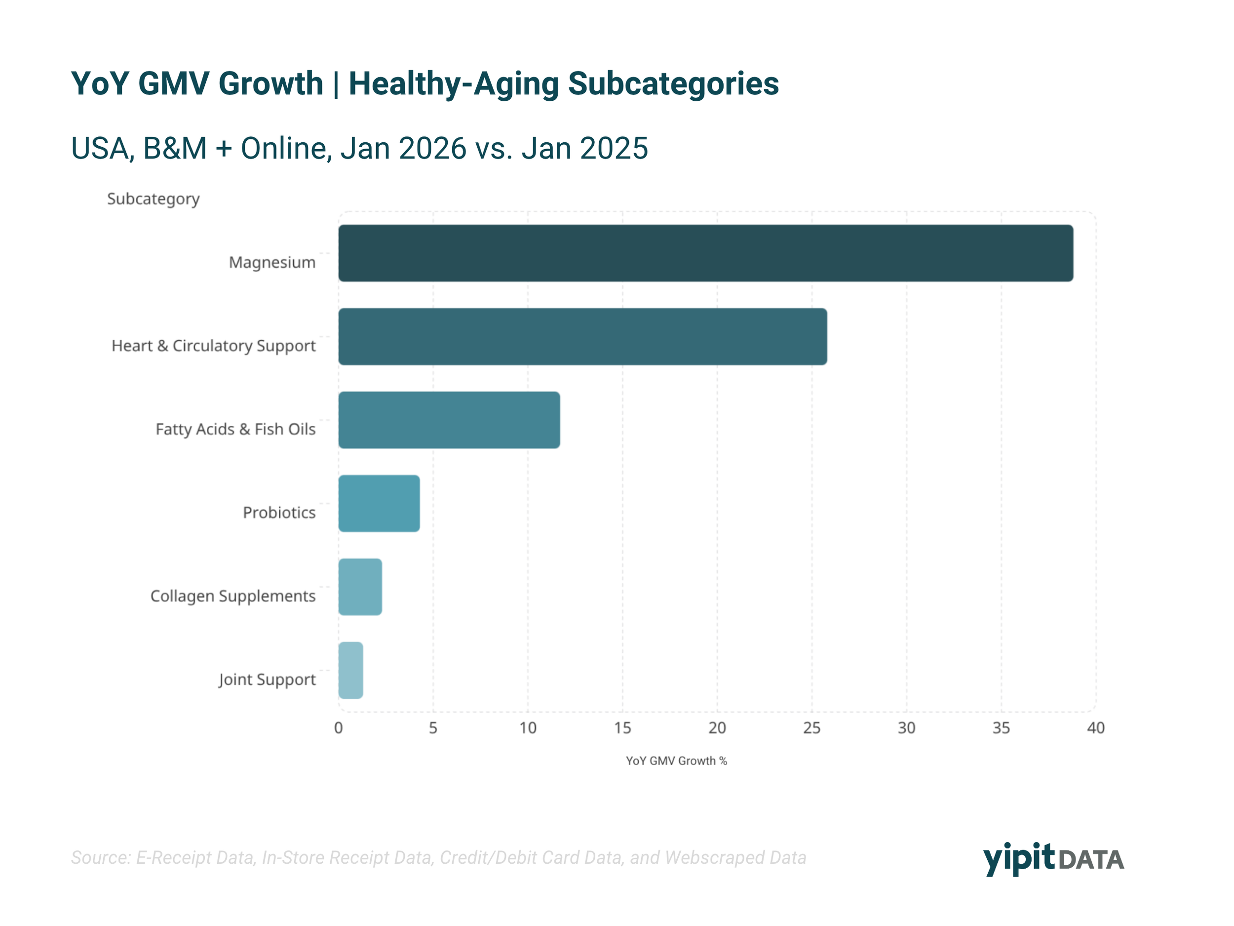 YipitData tracks trends across categories such as sports nutrition and healthy aging, including shifts in retailer share, brand performance, product formats, and shopper behavior. This provides a detailed view of how the supplement market is evolving over time.