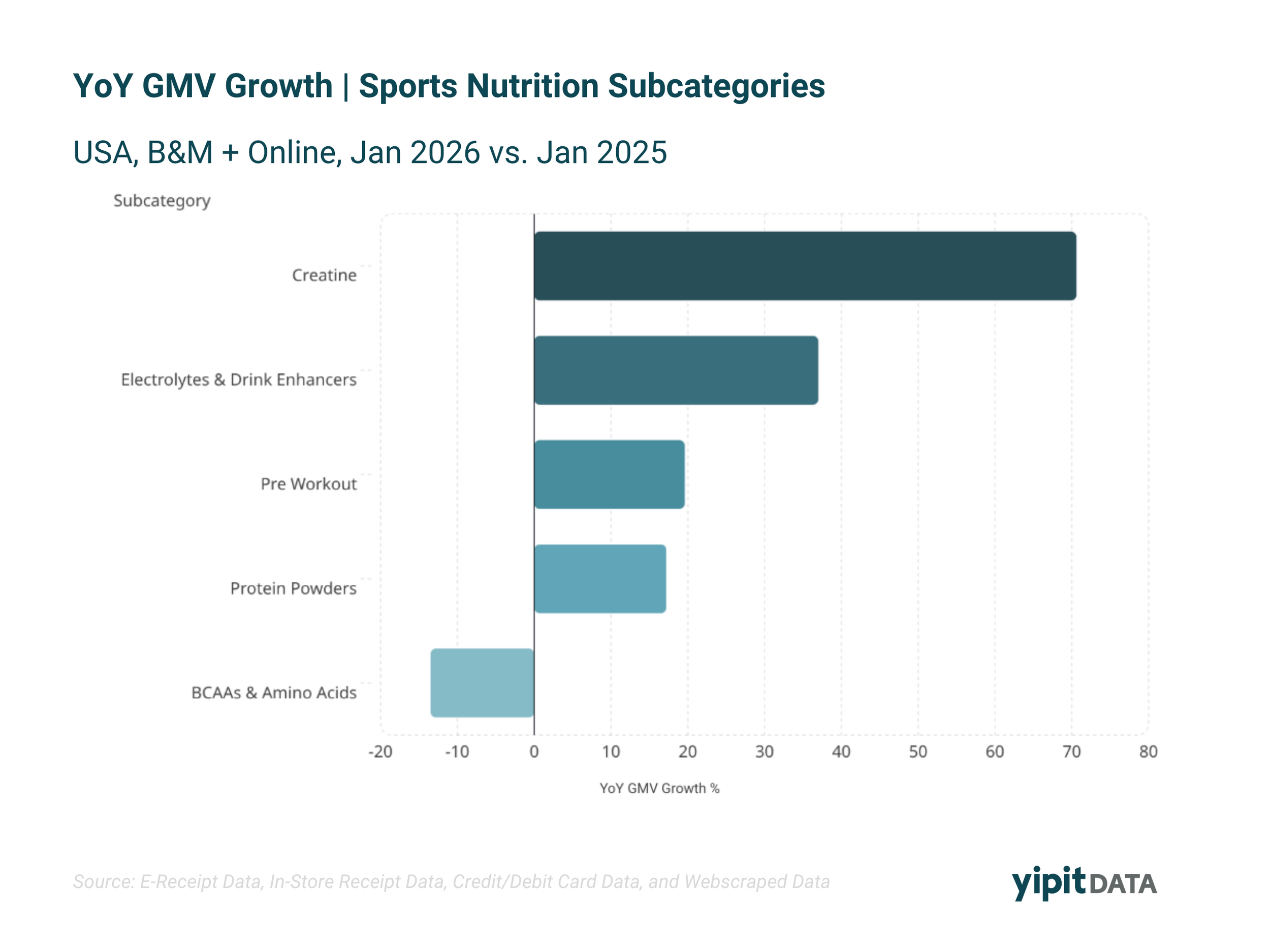 Creatine has emerged as the fastest-growing subcategory, gaining share year over year, while protein powders, electrolytes, and pre-workout products are also expanding.