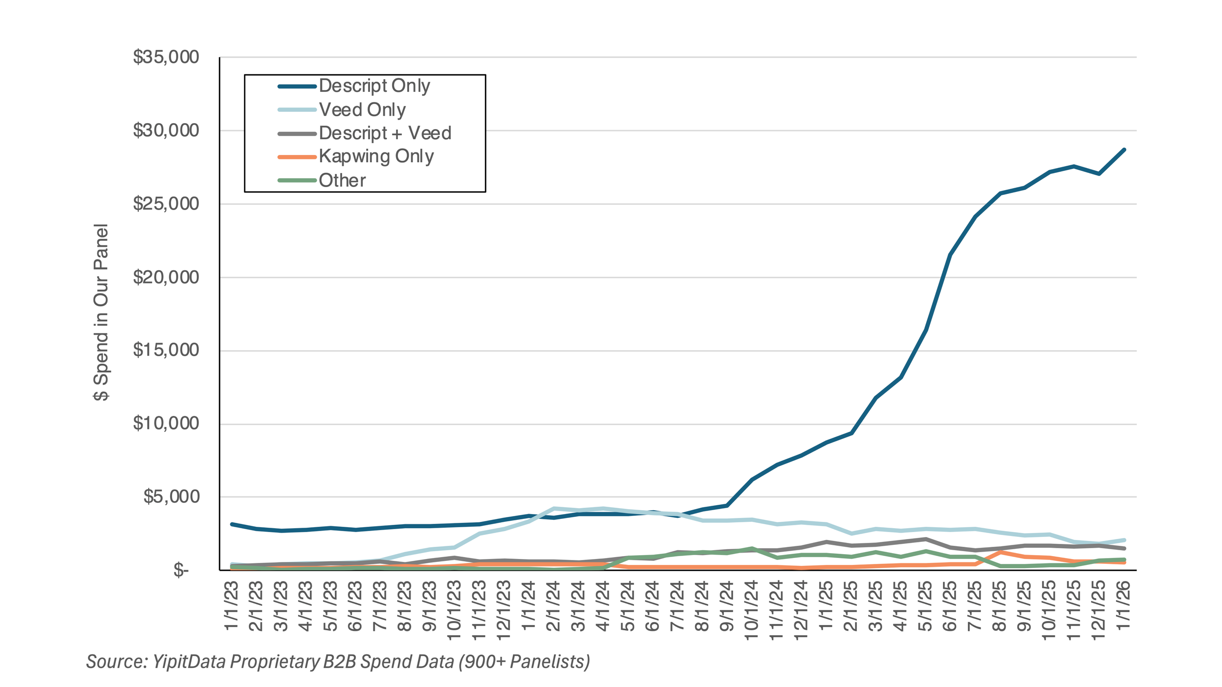 Descript continues to lead the category on monetization, with that lead driven by a sharp acceleration in spend throughout 2025.