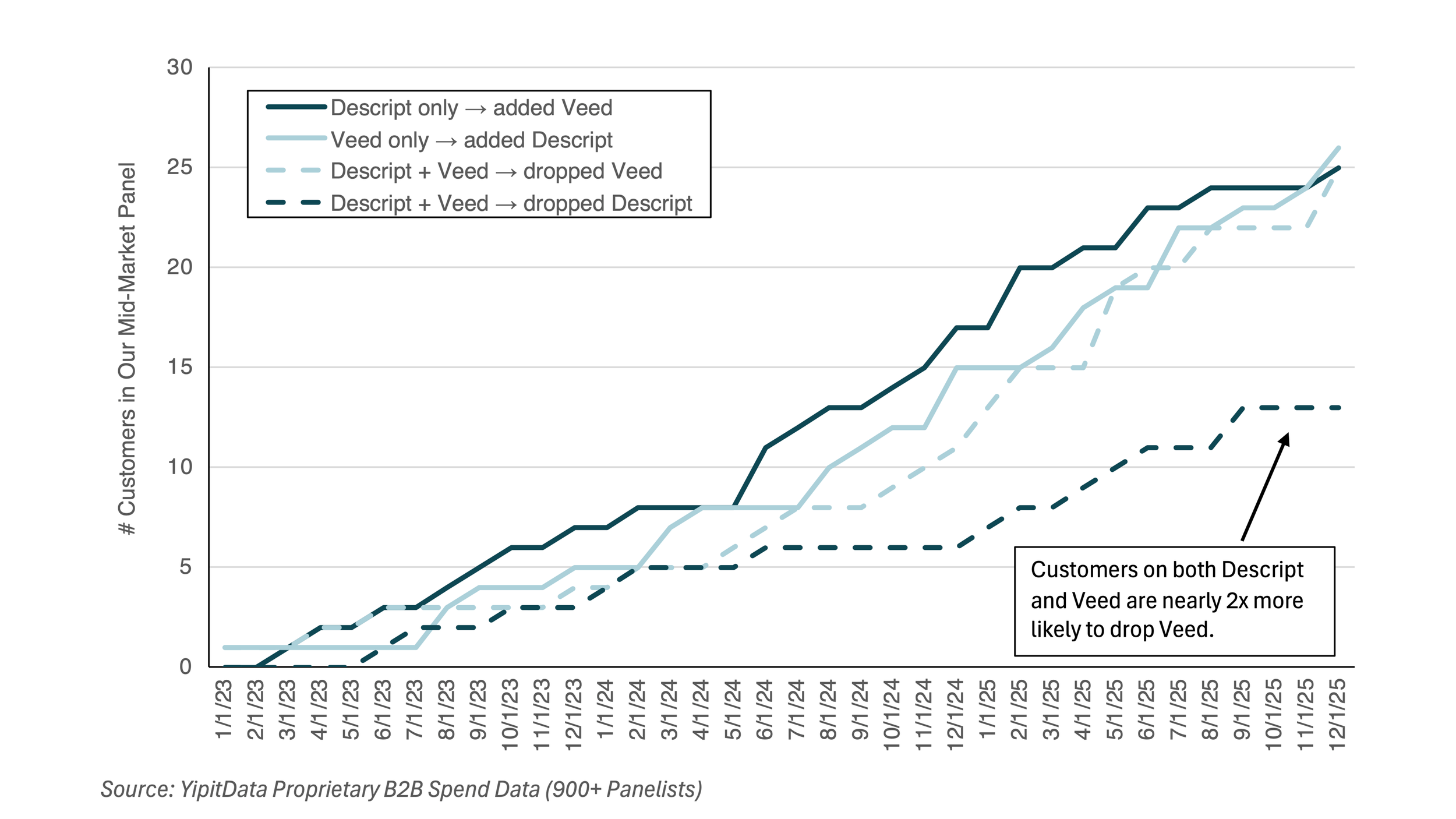 Yes, multi-vendor usage is common, but YipitData's data suggests it's often temporary. Experimentation is high — 25 Veed-only customers added Descript over the observed period, a figure roughly symmetrical to Descript-only customers adding Veed. However, when teams ultimately consolidate, retention patterns currently favor Descript.