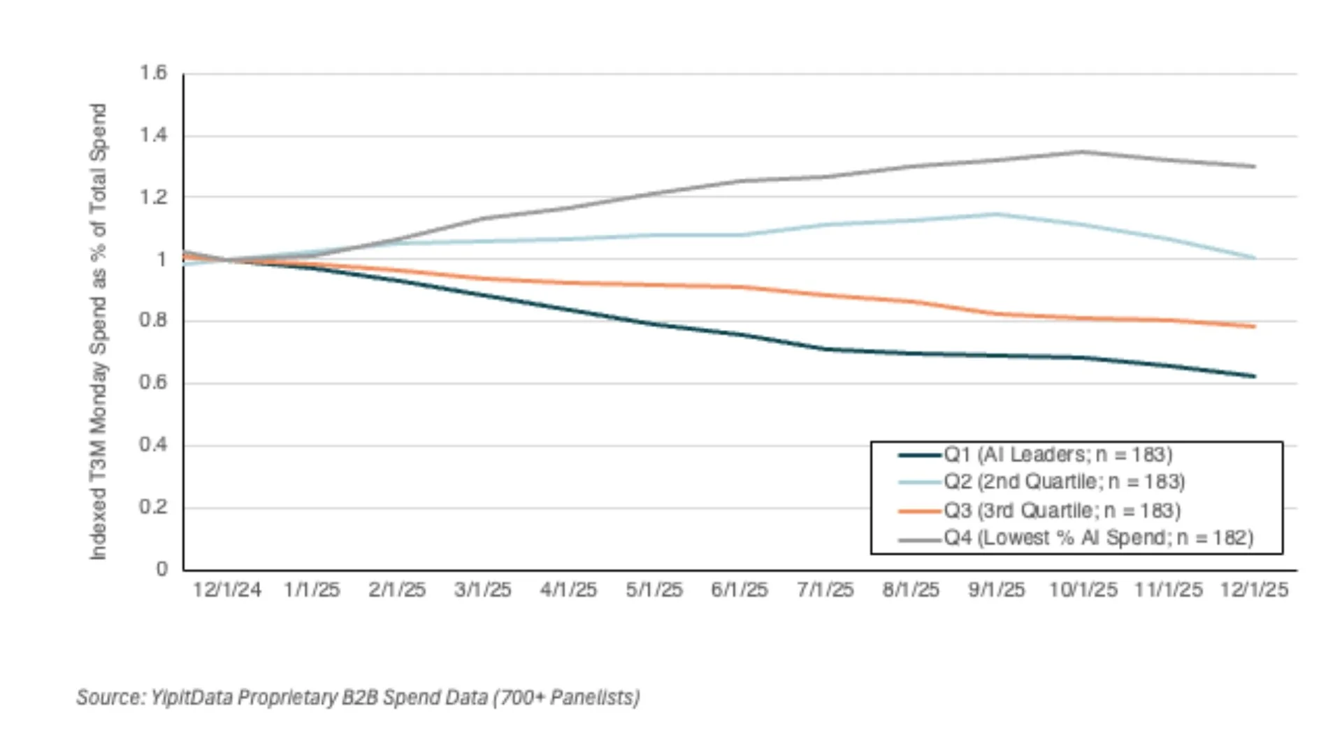 Exhibit 5: AI leaders also show declining monday.com spend share, though divergence from the rest of the panel appears more moderate than Asana and Atlassian