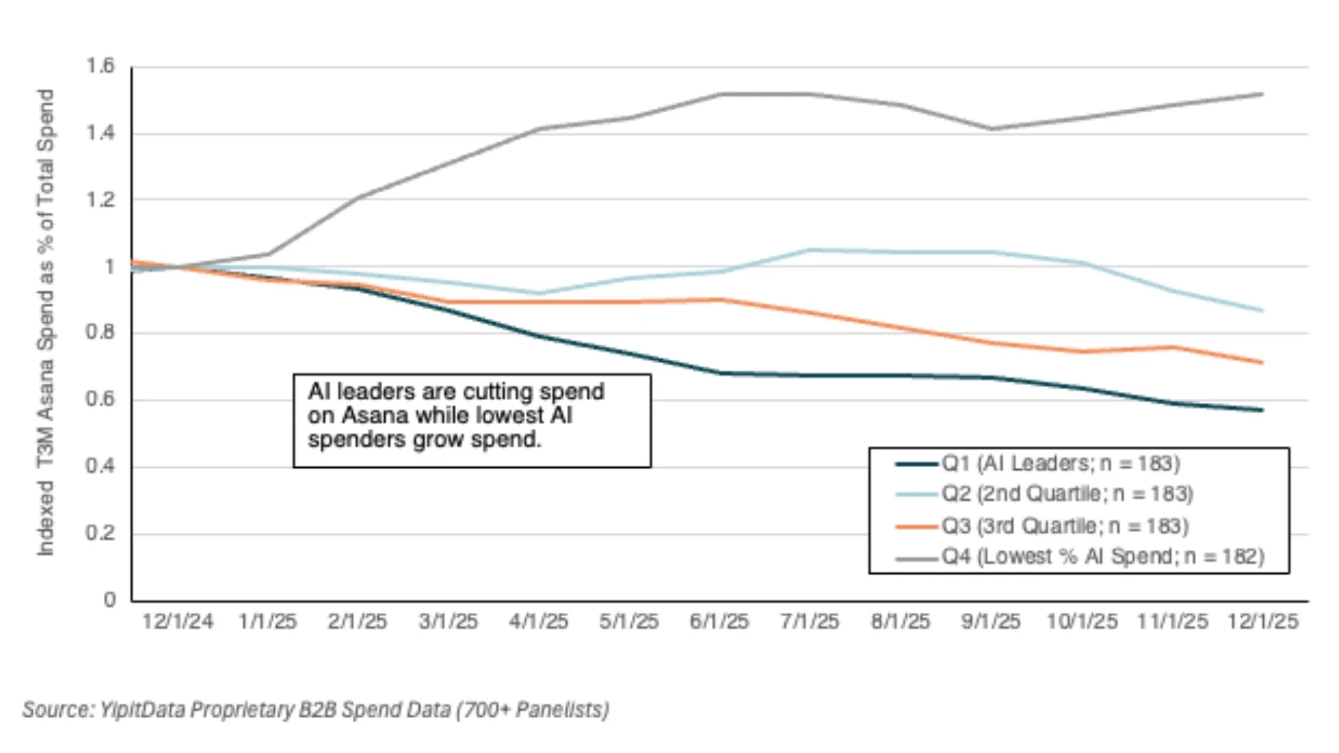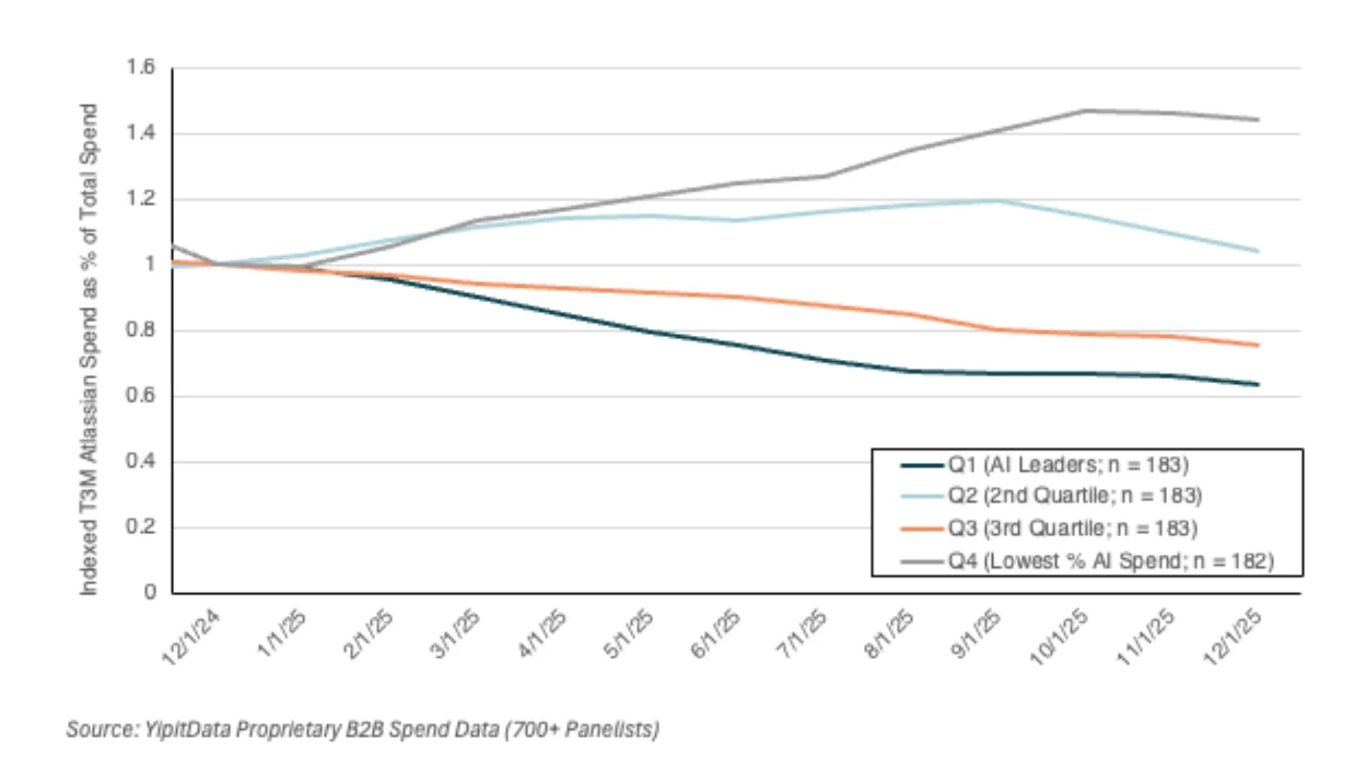 The pattern for Atlassian broadly mirrors what we observe with Asana. Companies leading in AI adoption show declining spending share on Atlassian products, while companies with lower AI investment show steadier or increasing demand.