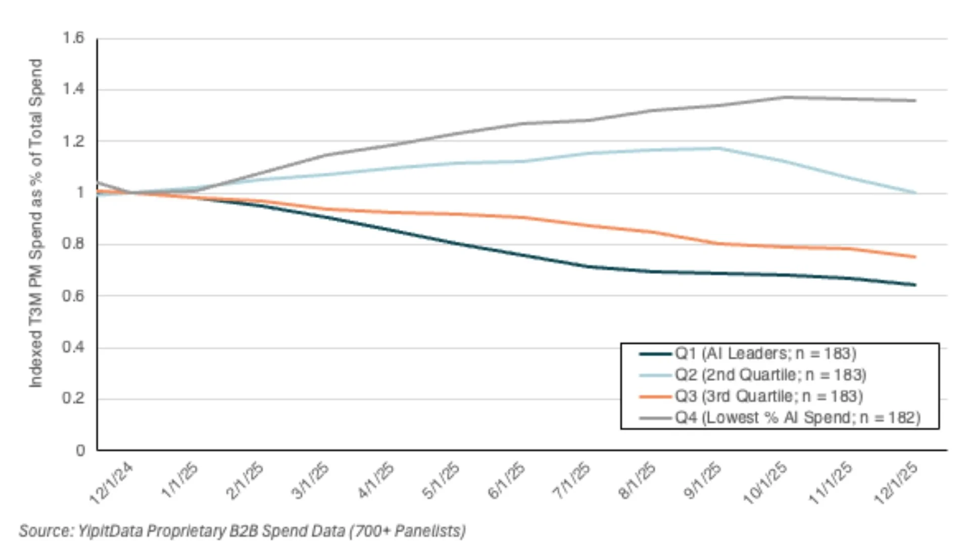 This creates a clear separation in spending behavior between AI-intensive organizations and companies with lower AI adoption.